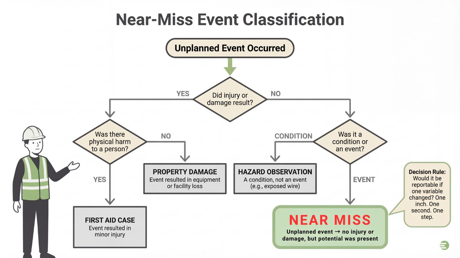 Inconsistent Near Miss Reporting definitions create “definition drift,” making your data useless for trending. A near miss is an unplanned event with potential for injury, damage, or loss, but resulted in none. Distinguish it explicitly from: