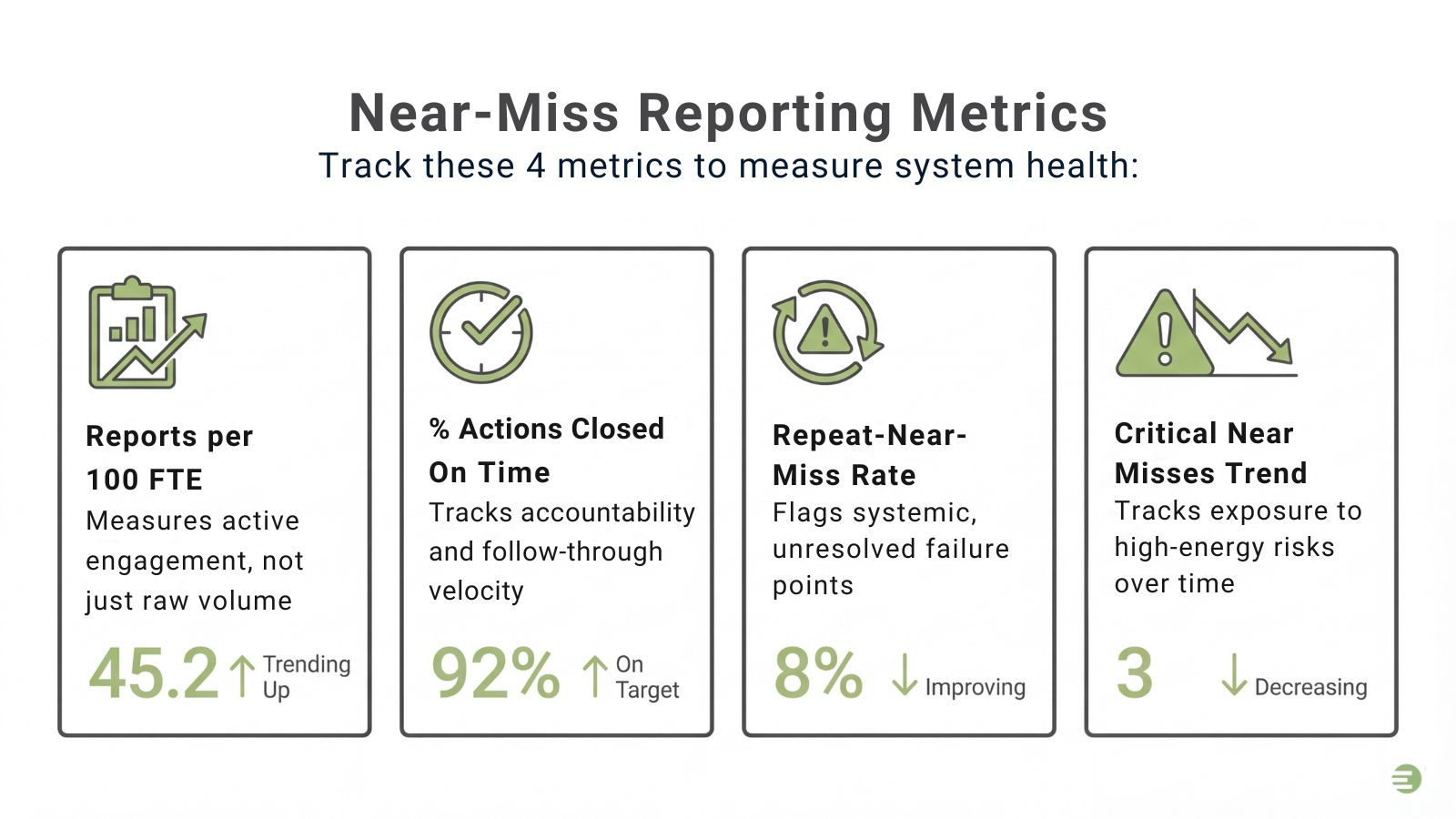 Near misses are your most powerful leading indicators that reveal where your system will fail before it produces a recordable injury or fatality. Unlike lagging indicators (TRIR, DART, EMR), which measure damage already done, leading indicators like near-miss frequency measure prevention in real time. For a deeper breakdown, see our full guide: Safety Metrics: Leading and Lagging Indicators and Why You Need Both →