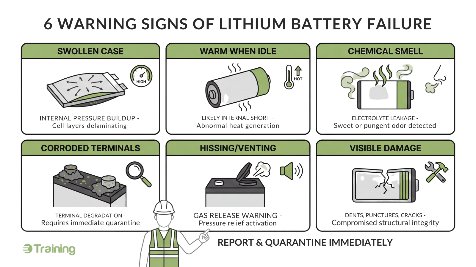 Train workers on hazard recognition. Every person handling battery-powered equipment needs to know the warning signs of battery failure, what to do when they find a damaged battery, and basic safe charging practices. (Lithium Battery Awareness Course)